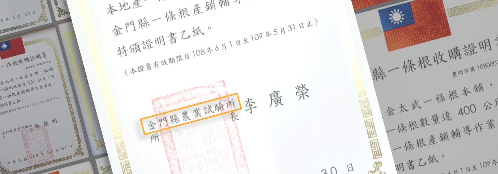 一條根契作認證是由金門縣農業試驗所(簡稱農試所)頒發與統一控管,金門各地方農會並非官方渠道呦!