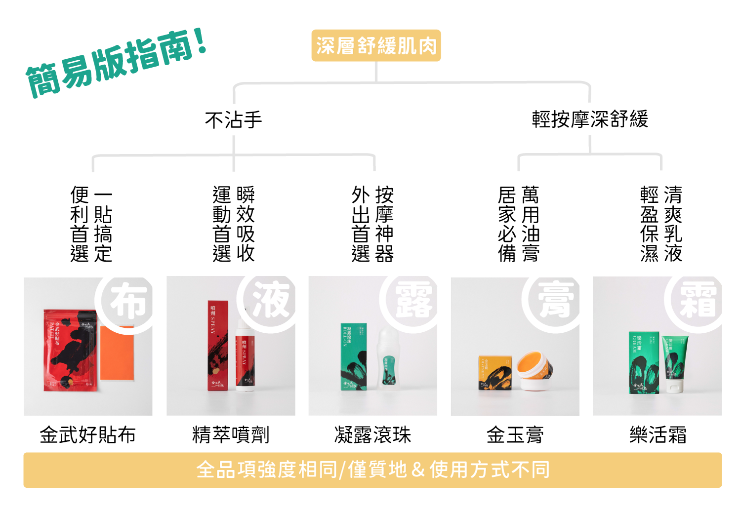 金太武販售的金門一條根系列商品,均添加高含量金門一條根萃取液,其效果及強度一樣強,推出貼布、膏狀、液狀、凝露狀、霜狀產品,其實是為了符合各種使用需求。