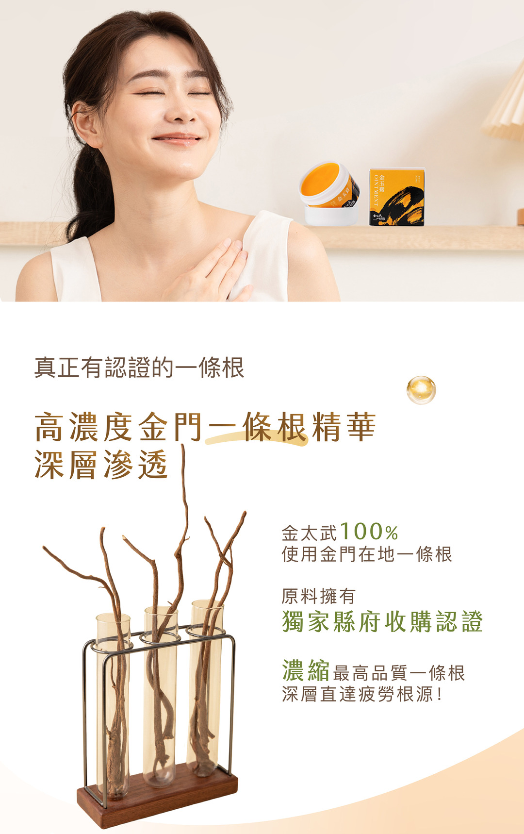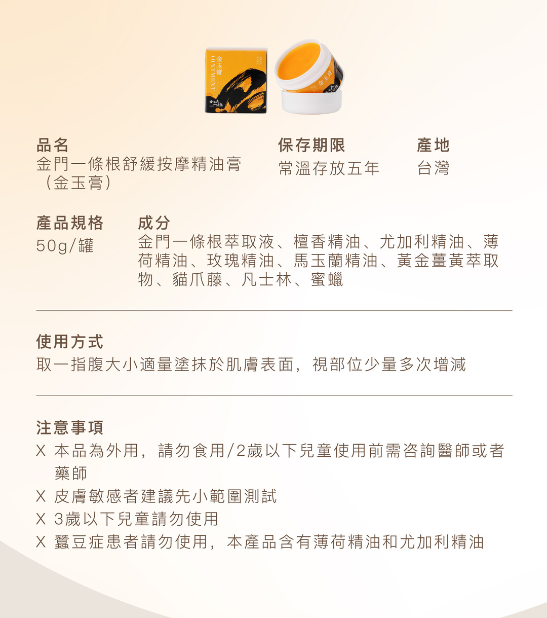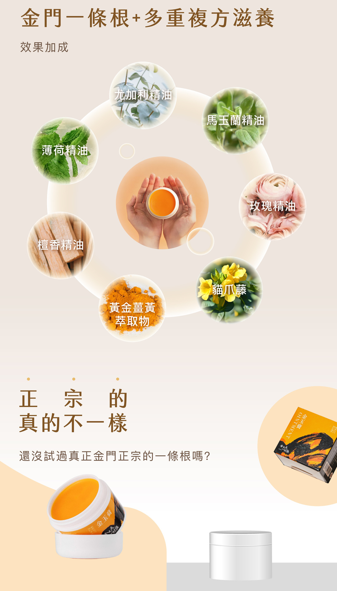 成分:金門一條根萃取液、檀香精油、尤加利精油、薄荷精油、玫瑰精油、馬郁蘭精油、黃金薑黃萃取物、貓爪藤、凡士林、蜜蠟。