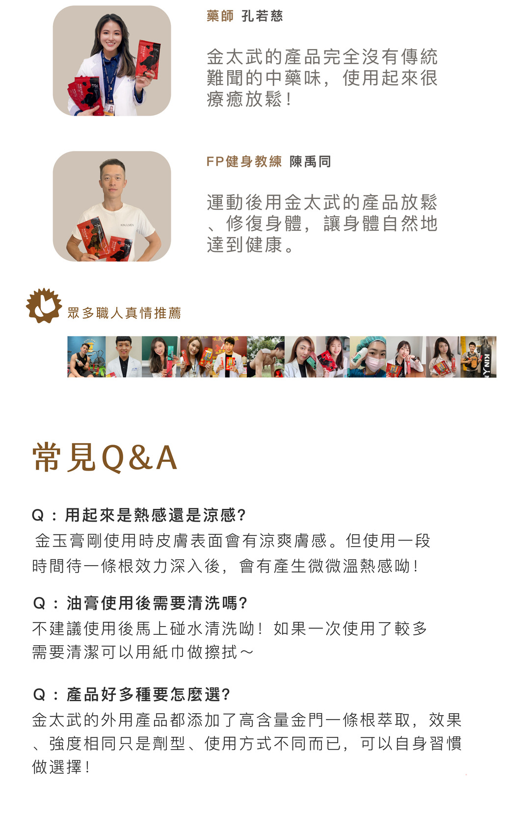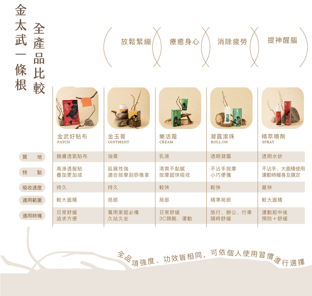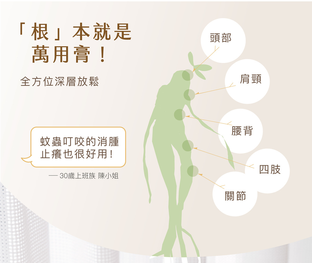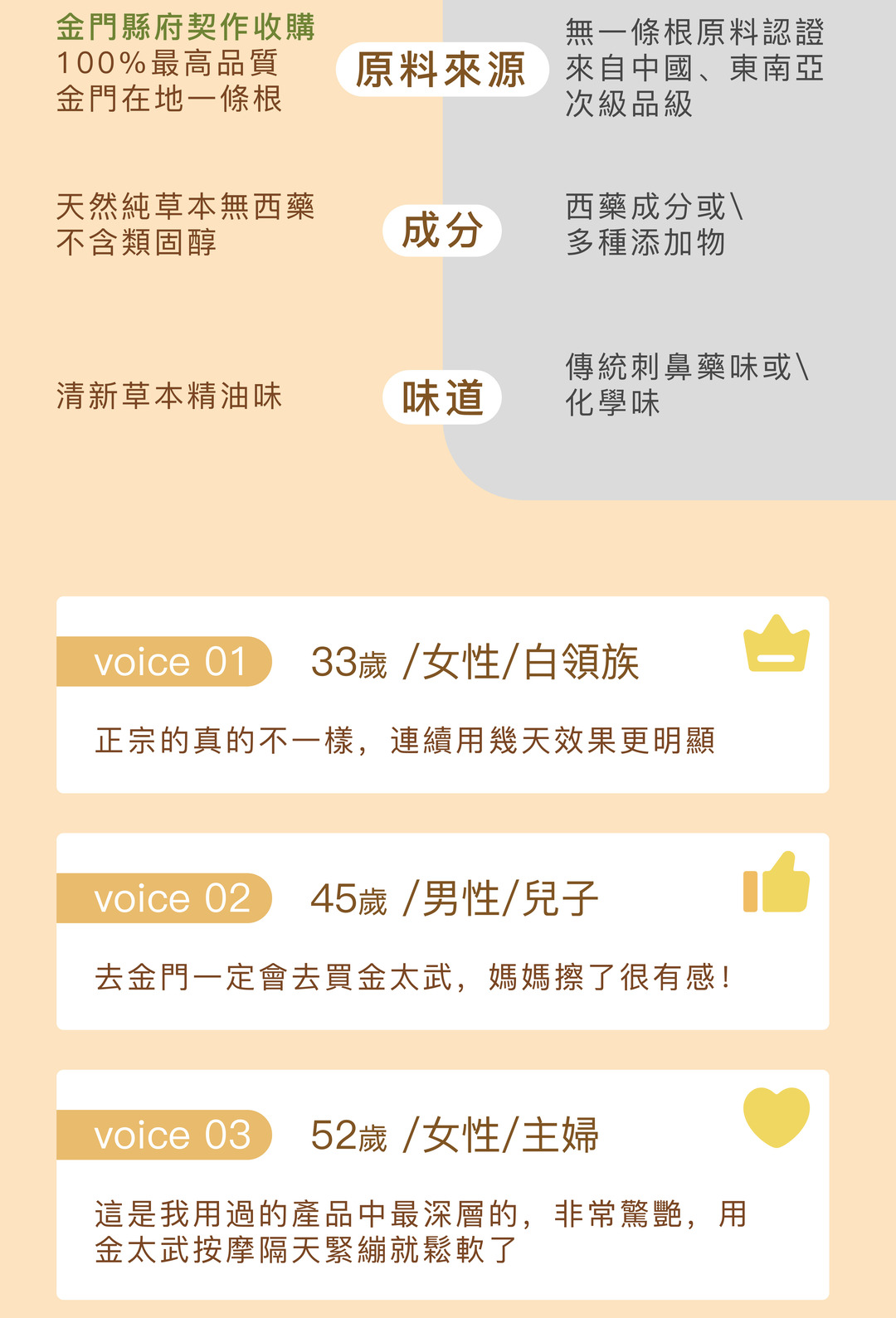 成分:金門一條根萃取液、檀香精油、尤加利精油、薄荷精油、玫瑰精油、馬郁蘭精油、黃金薑黃萃取物、貓爪藤、凡士林、蜜蠟。
