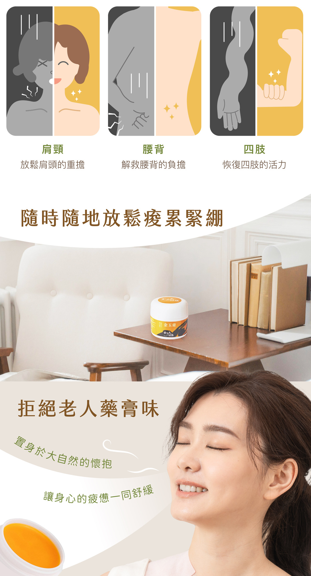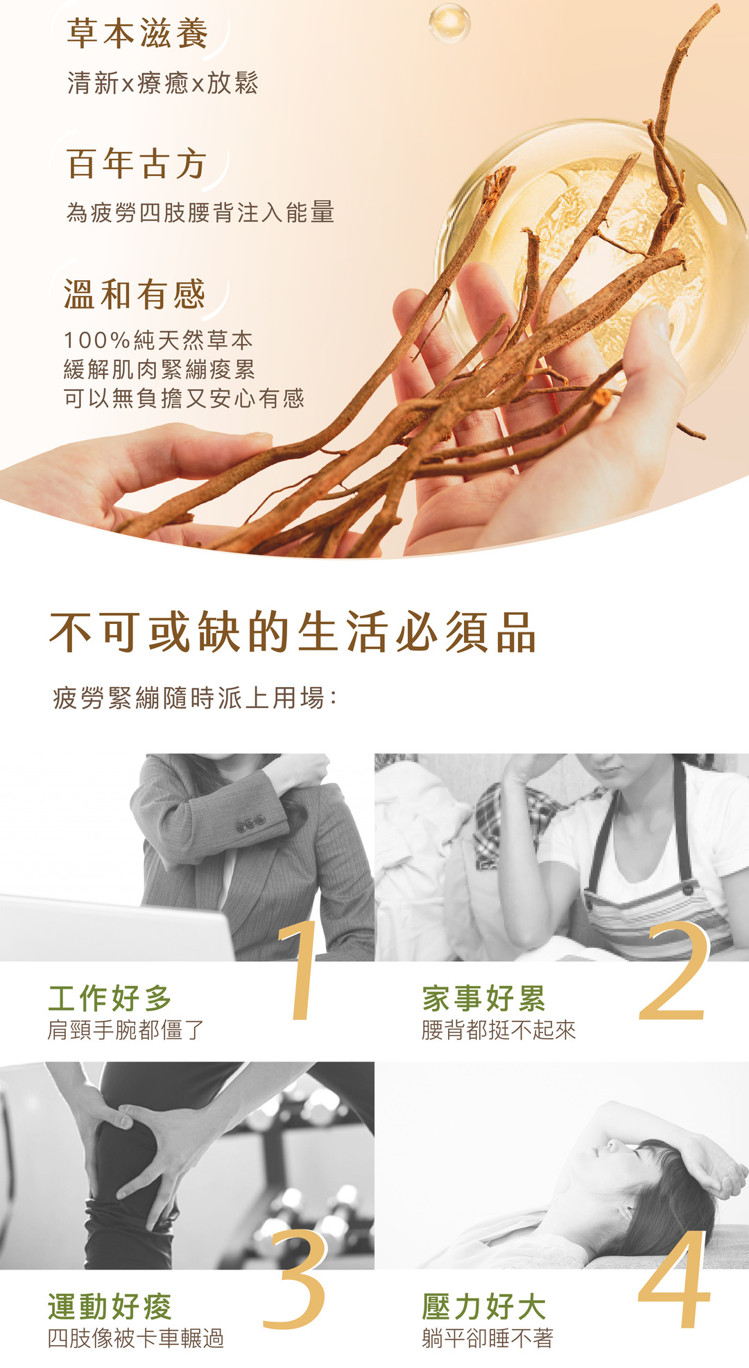 適用於家事勞累、工作疲勞、運動前後、手機/電腦族肩頸不適等日常疲勞