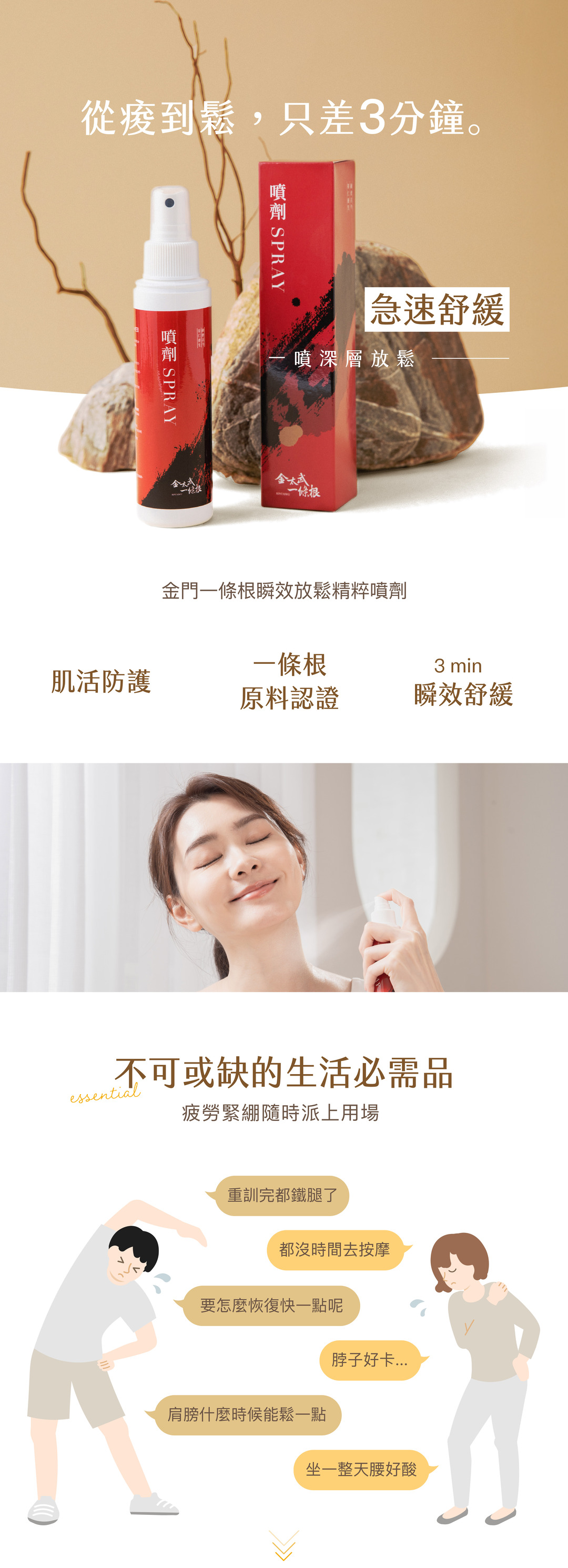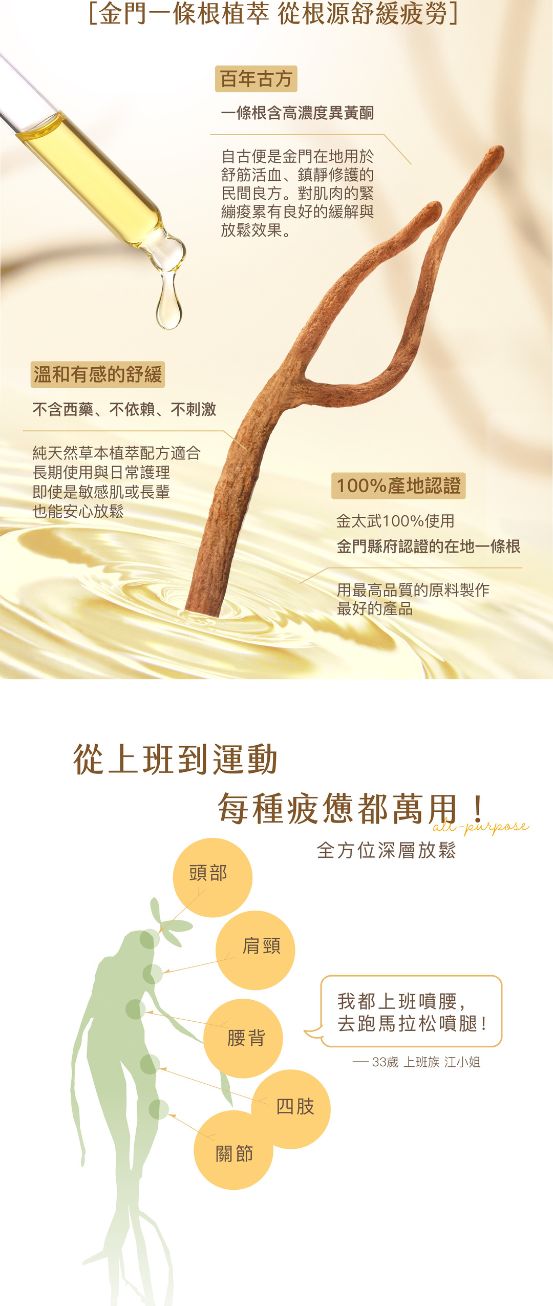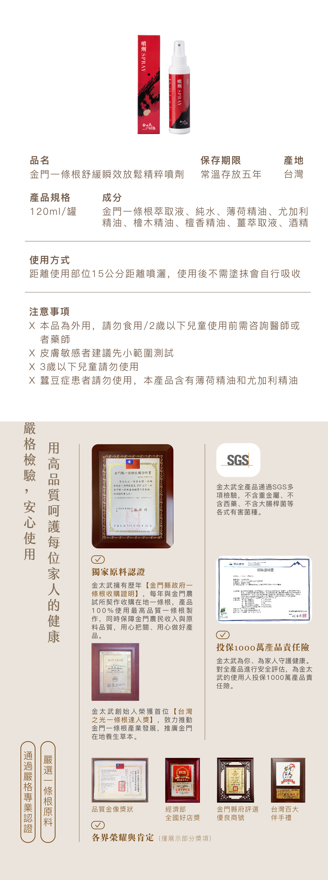 成分:金門一條根萃取液、純水、薄荷精油、尤加利精油、檜木精油、檀香精油、薑萃取液、酒精。